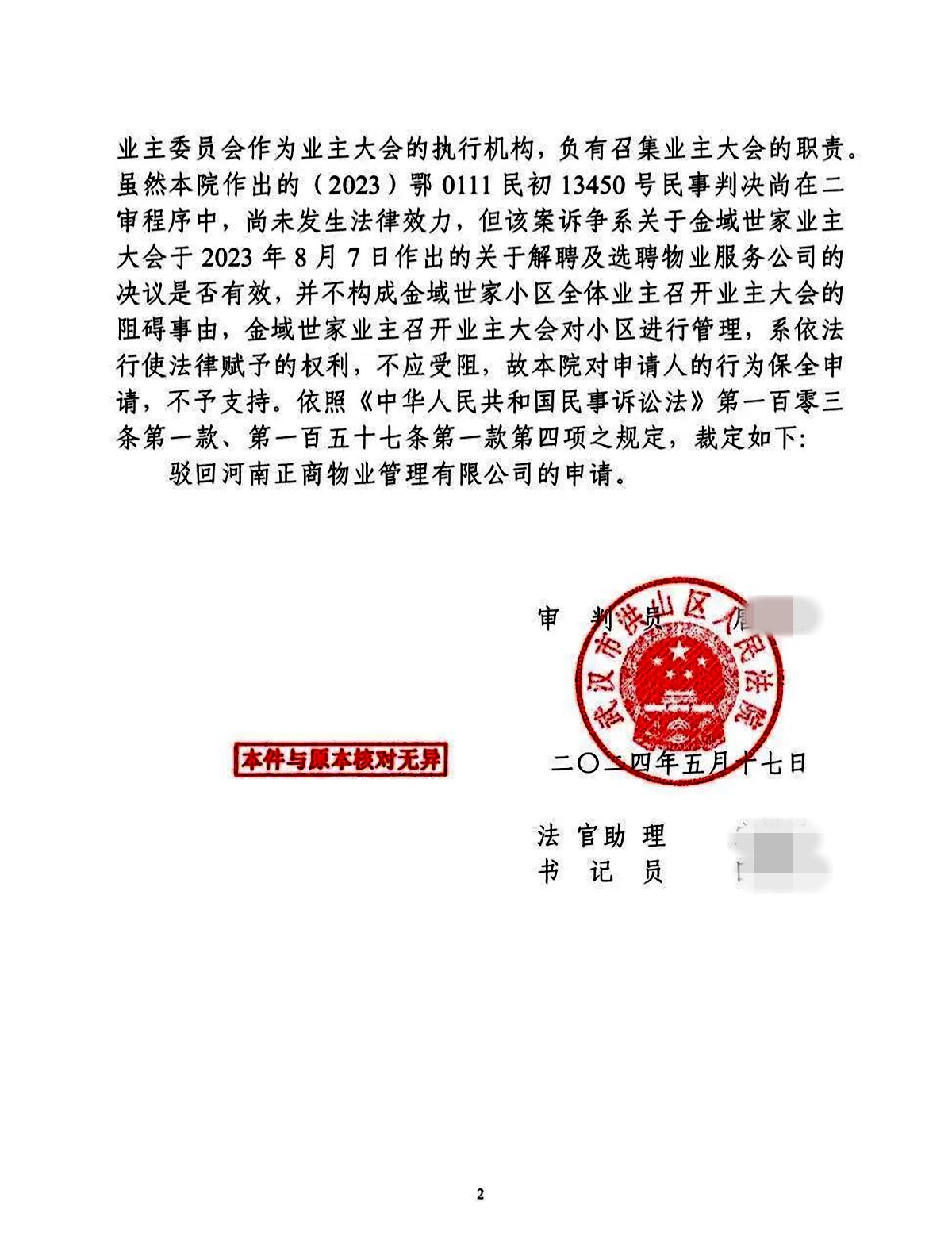 湖北武汉一小区物业公司申请停止召开业主大会,法院裁定不应受阻驳回申请