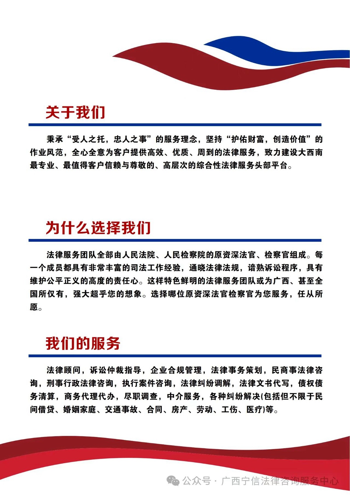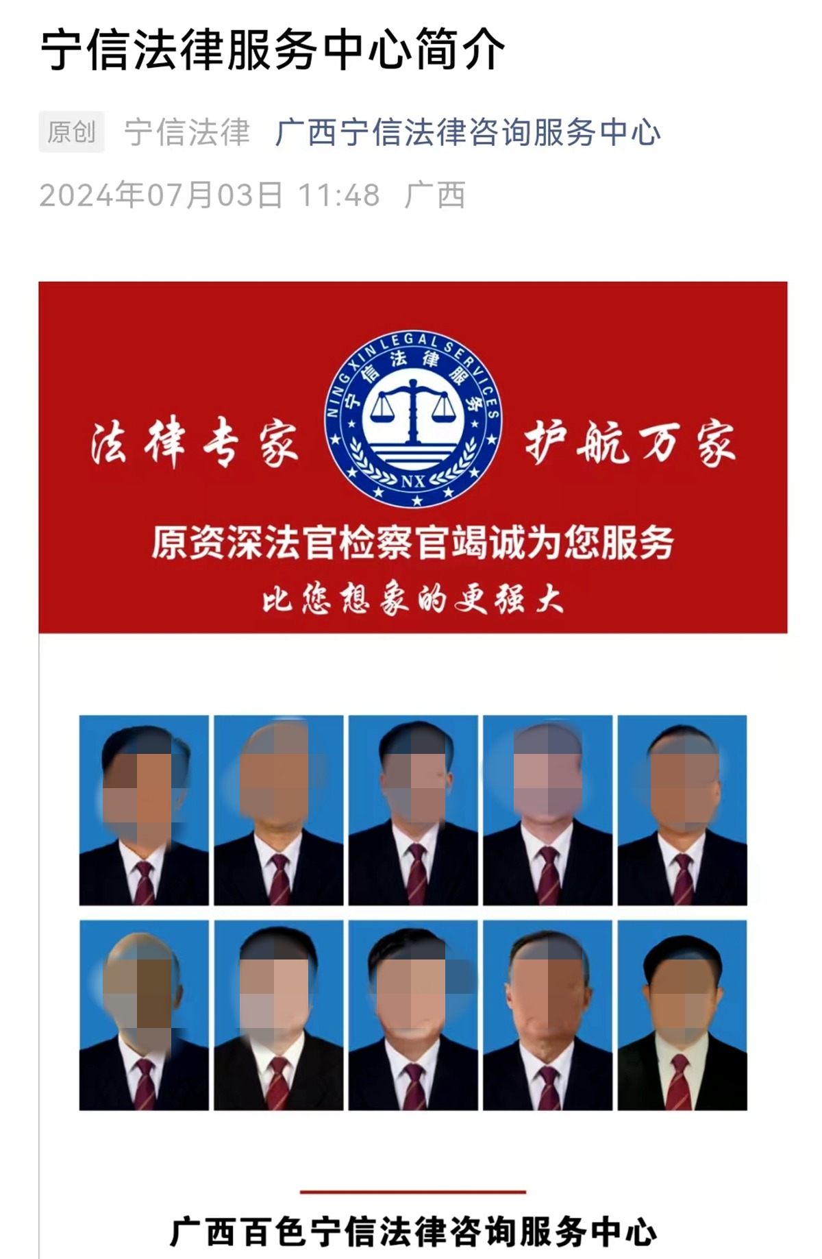 7月3日,广西百色宁信法律咨询服务中心微信公众号发布宁信法律服务中心简介推文,其中推文简介“为什么选择我们”介绍:法律服务团队全部由人民法院、人民检察院的原资深法官、检察官组成。这样特色鲜明的法律服务团队或为广西、甚至全国所仅有,强大超乎您的想象。