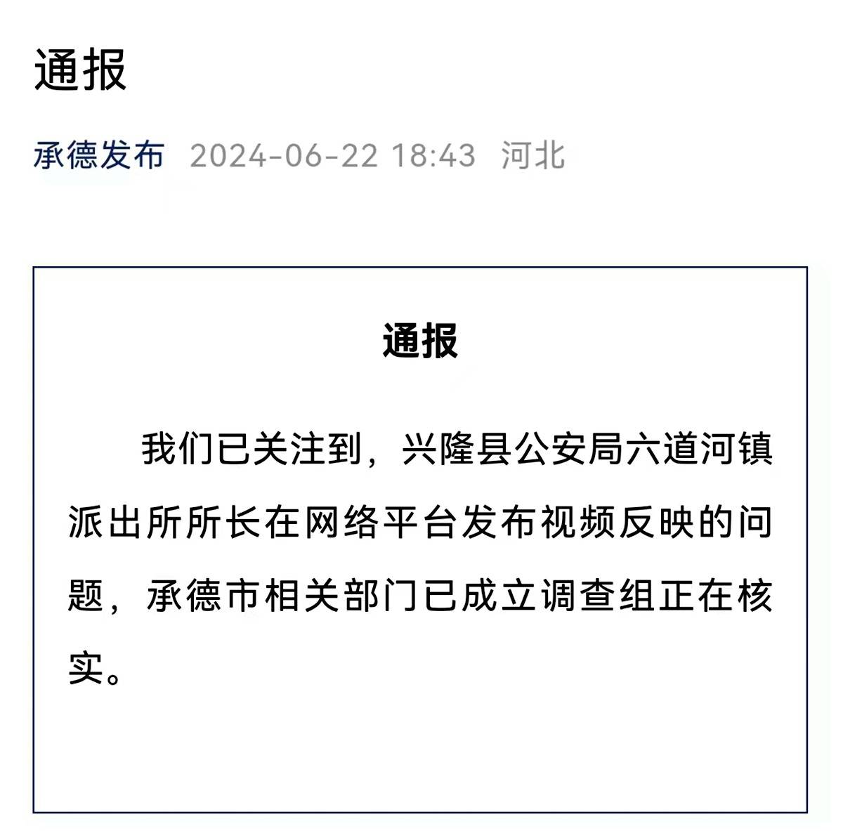 大众新闻报注意到,6月22日下午,承德市委宣传部微信公众号“承德发布”发布通报。通报称:我们已关注到,兴隆县公安局六道河镇派出所所长在网络平台发布视频反映的问题,承德市相关部门已成立调查组正在核实。