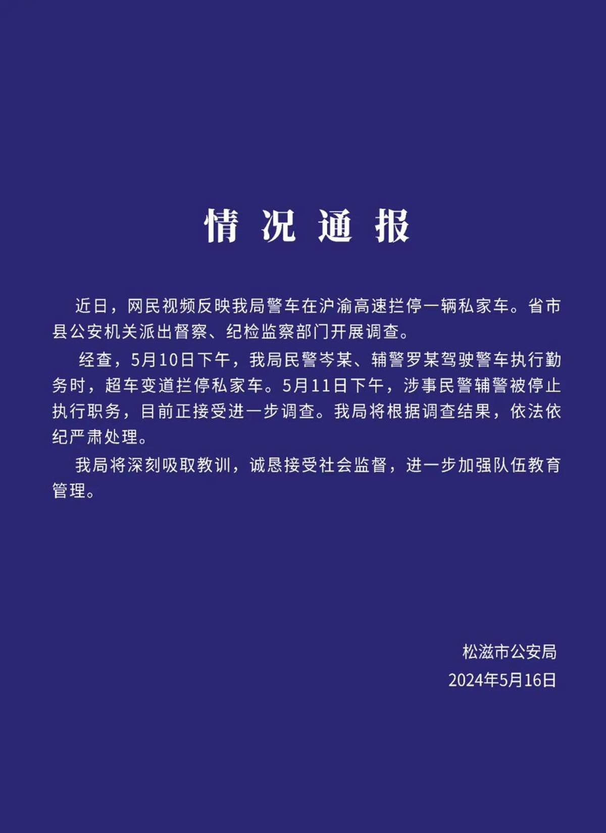 经查,5月10日下午,松滋市公安局民警岑某、辅警罗某驾驶警车执行勤务时,超车变道拦停私家车。5月11日下午,涉事民辅警被停停止执行职务,目前正接受进一步调查。松滋市公安局将根据调查结果,依法依规严肃处理。