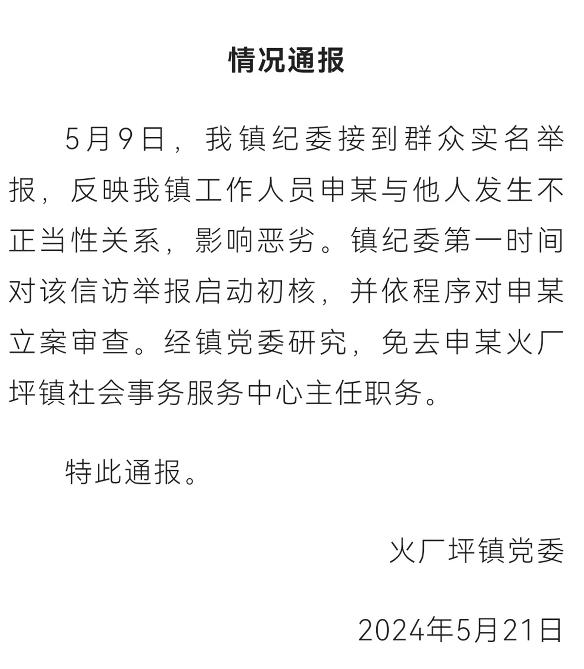 5月21日下午,火厂坪镇党委发布情况通报。通报称:5月9日,我镇纪委接到群众实名举报,反映我镇工作人员申某与他人发生不正当性关系,影响恶劣。镇纪委第一时间对该信访举报启动初核,并依程序对申某立案审查。经镇党委研究,免去申某火厂坪镇社会事务服务中心主任职务。