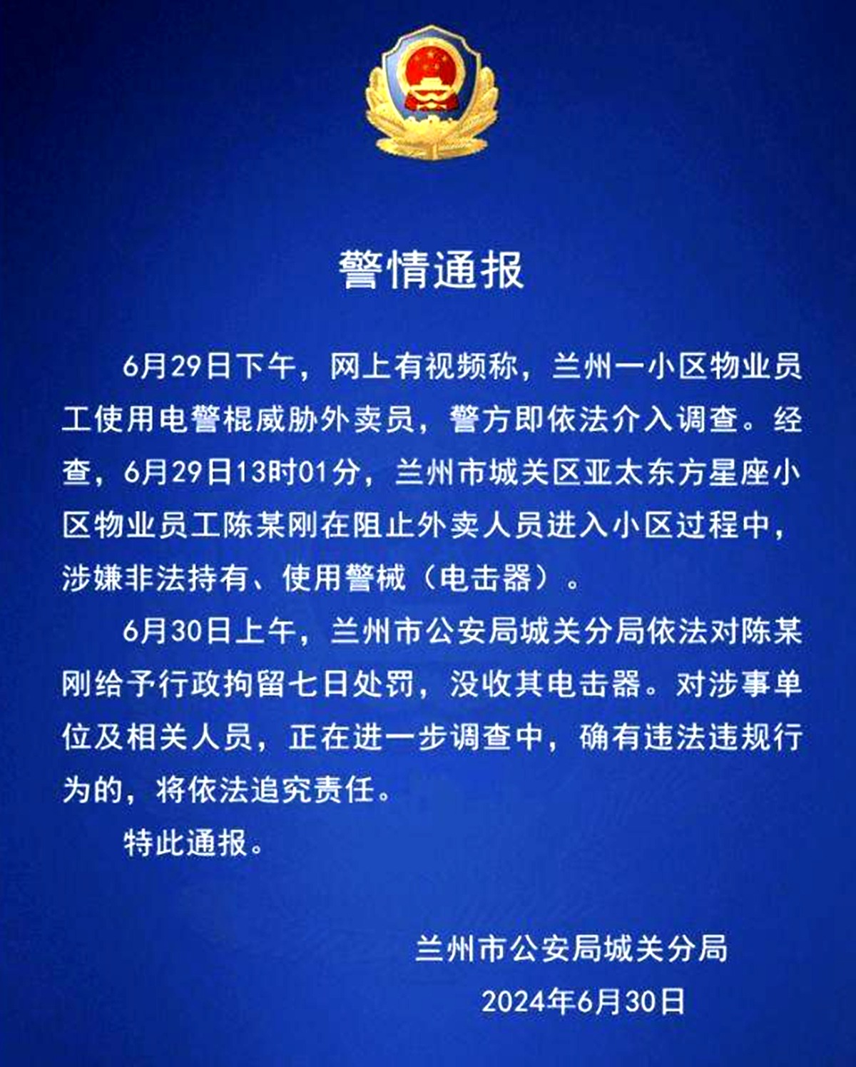 6月30日,兰州市公安局城关分局发布警情通报。通报称:6月29日下午,兰州一小区物业员工使用电警棍威胁外卖员,警方即依法介入调查。