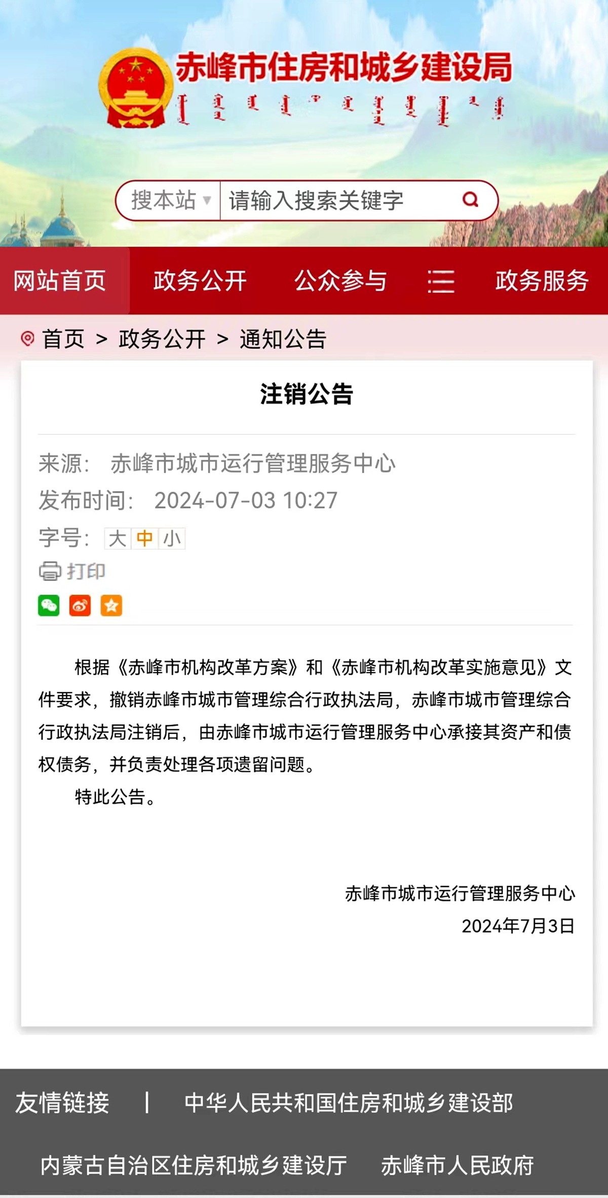 7月3日,赤峰市城市运行管理服务中心发布《注销公告》(下称公告),注销赤峰市城市管理综合行政执法局。