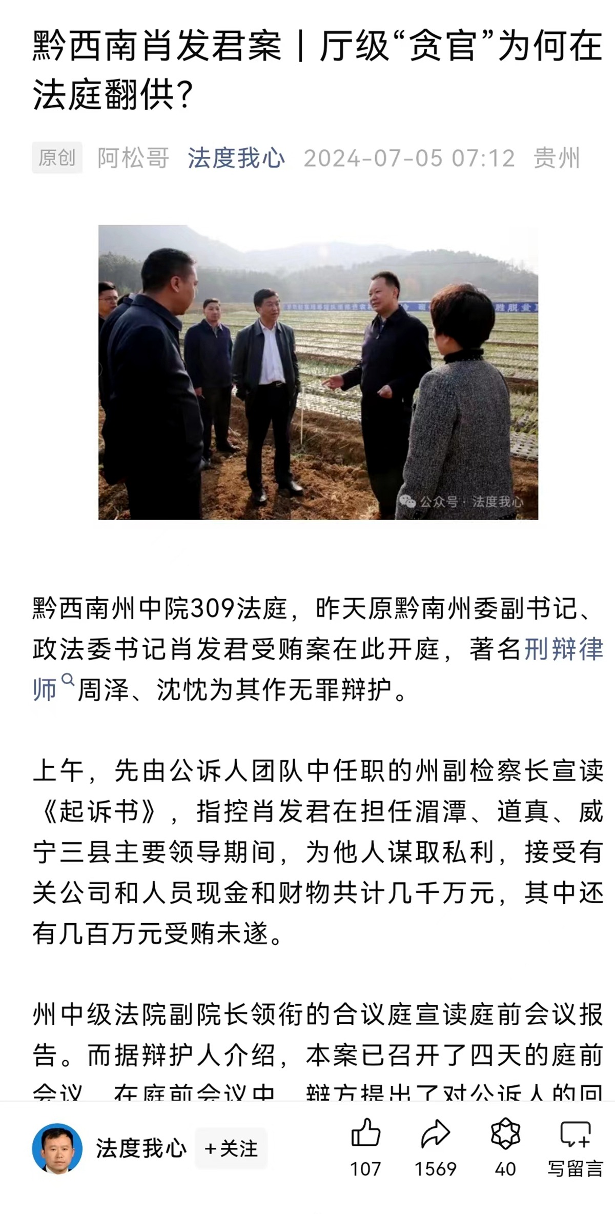 7月5日,认证主体为邹松律师的“法度我心”微信公众号,以《黔西南肖发君案|厅级“贪官”为何在法庭翻供?》一文,披露贵州黔南州委原副书记、政法委原书记肖发君受贿案, 昨日在黔西南州中级人民法院开庭审理,相关律师为其作无罪辩护。
