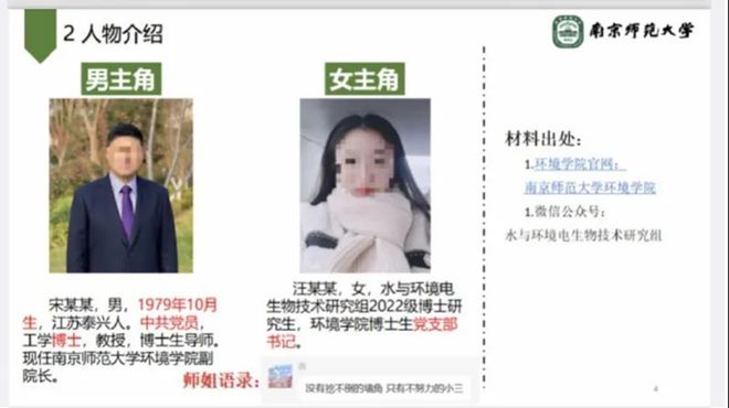 近日,一份南京师范大学环境学院副院长宋某某出轨女博士生的PDF在网上流传,引发关注和热议。