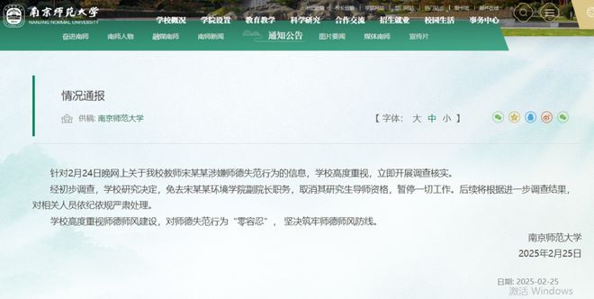 网传南京师范大学一副院长出轨女博士生 校方通报免职暂停工作